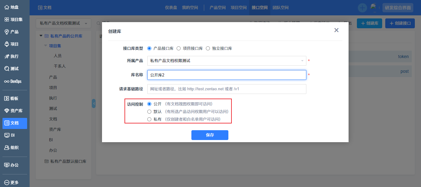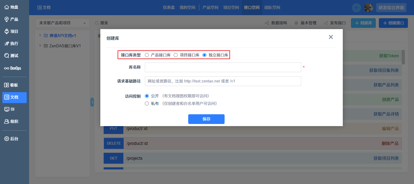 接口空间是接口文档的汇总空间,展示所有的接口文档,您可以在接口空间快速查阅需要的接口文档。接口空间创建接口库时增加关联产品或项目功能,您可以创建关联某个产品或项目的接口库,也可以选择不关联产品、项目,创建独立接口库,您可以根据场景需要创建合适类型的接口库。接口库的权限为公开、默认和私有。私有产品的接口库也可以设置为公开权限,公开权限的接口库不受产品权限限制,不管有没有产品权限都可以访问;当用户没有产品权限但接口库权限为公开时,在产品空间下看不到该产品,自然看不到该接口库,但是在接口库空间可以看到该产品及其接口库。