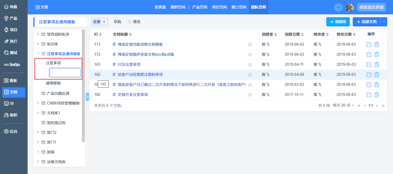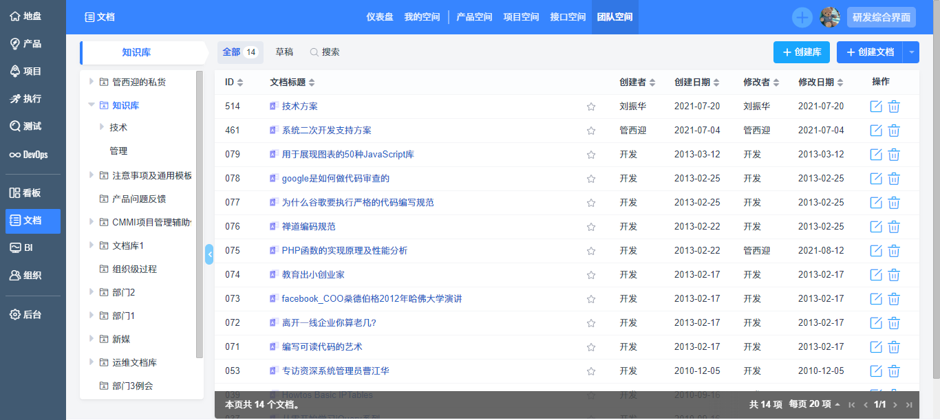 优化文档二级菜单的结构,调整为仪表盘、我的空间、产品空间、项目空间、接口空间、团队空间。将原项目库和执行库的文档合并在项目空间下,将Wiki和自定义库合并在团队空间,将文档进行归纳整理在各个空间下,方便您根据需要进各个空间查阅。文档仪表盘的区块内容调整,包括文档统计信息,我收藏的和最近更新的文档,产品文档和项目文档等过程文档,您可以从仪表盘快速查阅近期关注的文档;此外增加了浏览排行榜和收藏排行榜,将公司关注榜上的文档推荐给您,方便您跟进。