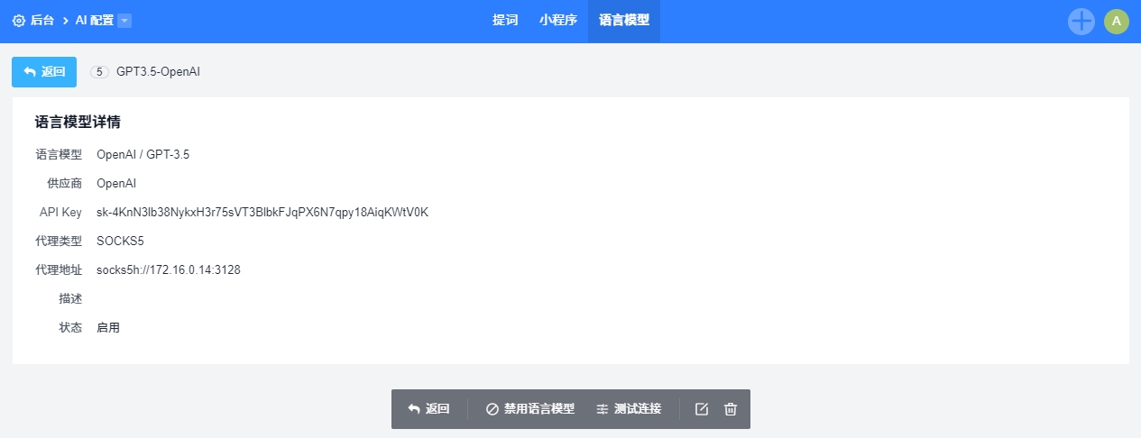 后台新增AI配置的入口,全面兼容常用语言模型,新增列表形式,支持配置开启多个语言模型,展示默认语言模型标识。支持添加、启用、禁用、编辑、删除和测试连接语言模型。为用户提供更高效和场景化的AI体验。