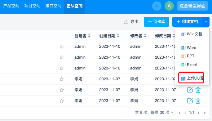 团队空间是组织层面的文档空间,您可以在团队空间下查看团队产生的文档。