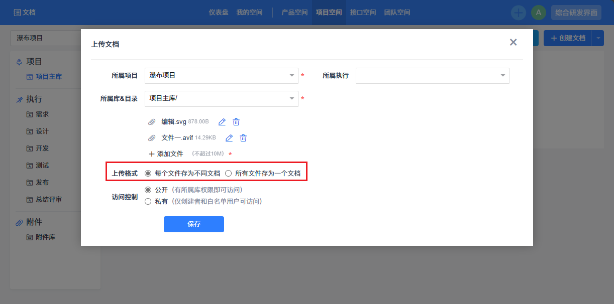 项目空间支持创建执行下的Wiki文档库和文档。在创建库时,所属执行字段选择项目下的执行,则创建执行库;若所属执行字段为空,则创建项目库;您可以在项目下直接创建执行的文档,无须到各执行下创建。