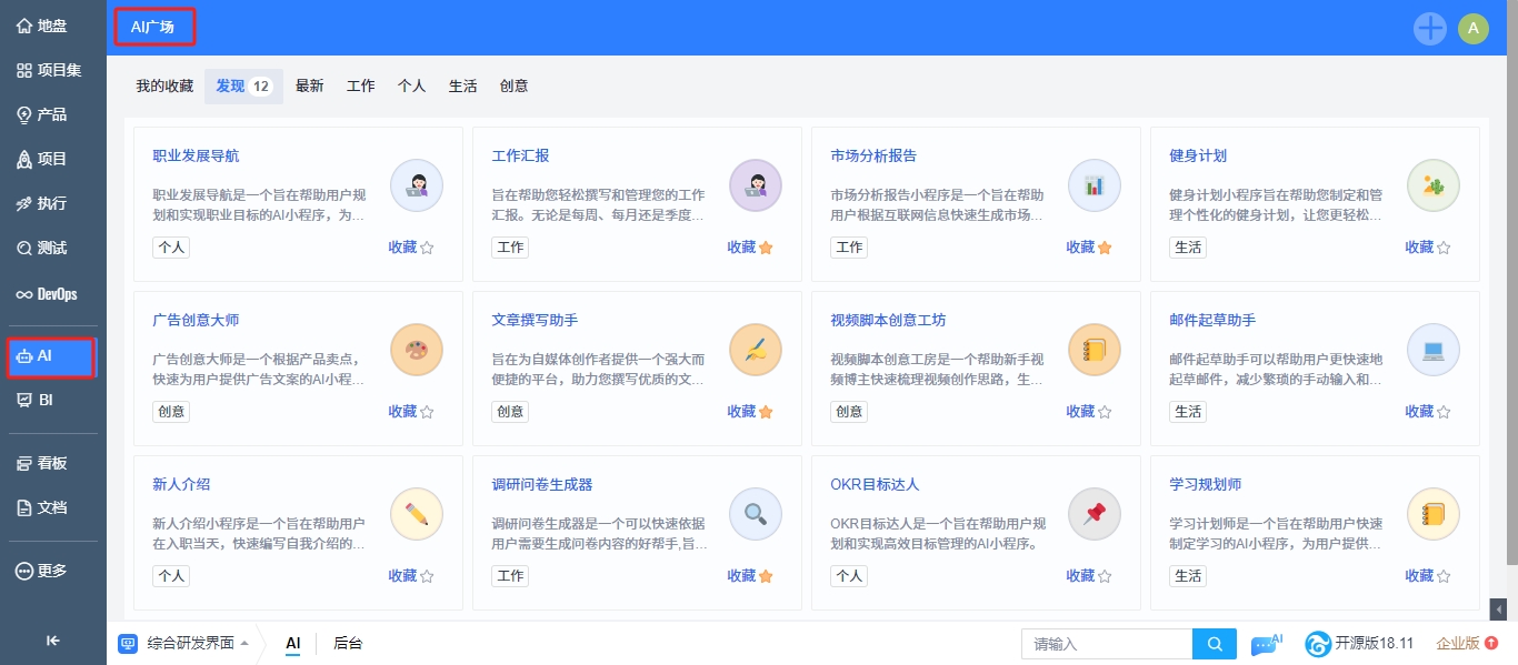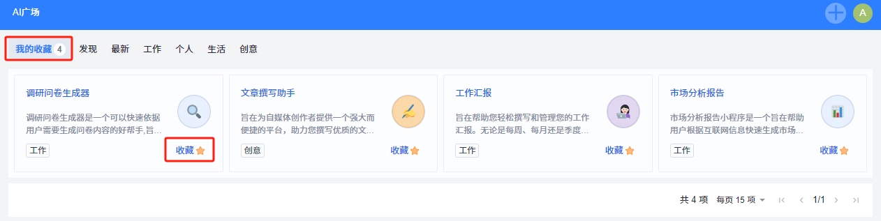 新增AI小程序广场,内置12个AI小程序,支持按类别查看。支持一键收藏小程序。