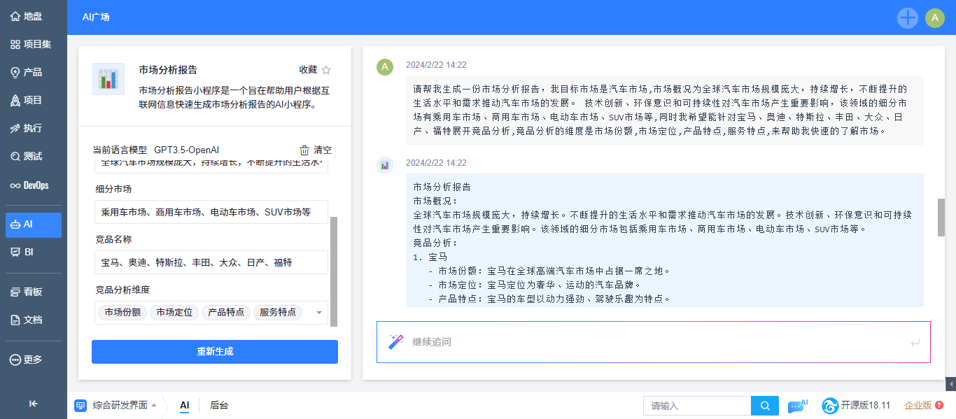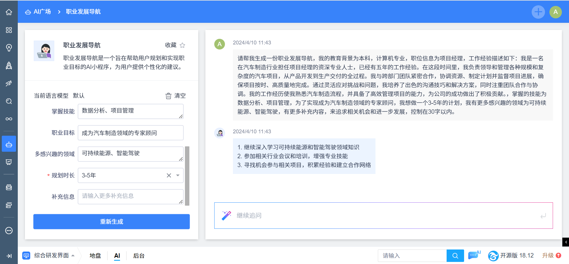 基于表单式输入便捷应用AI小程序,支持以继续追问的方式对生成结果进一步调优。