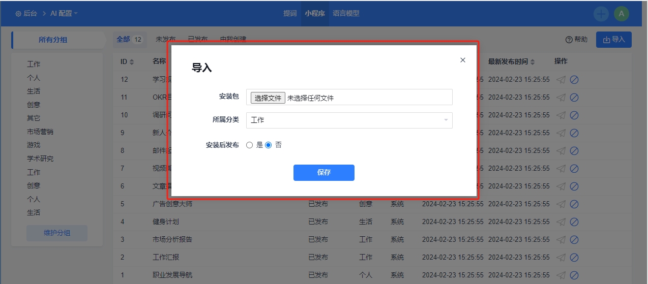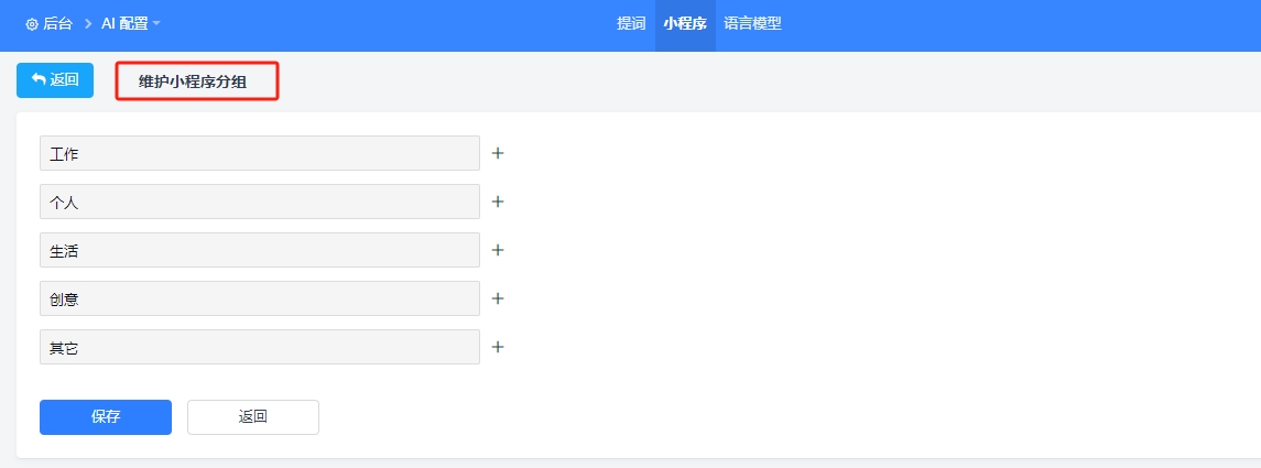 AI小程序支持维护类别。