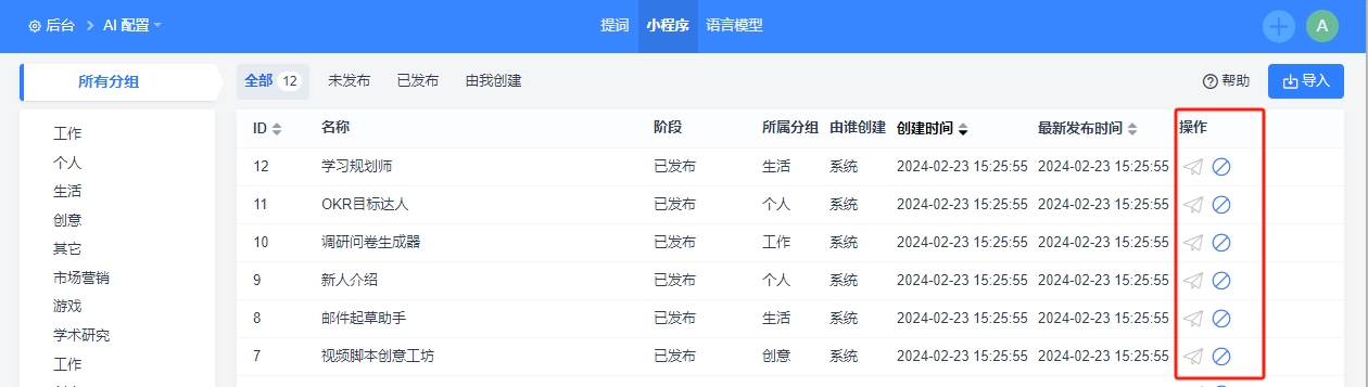 内置AI小程序支持发布或下架。