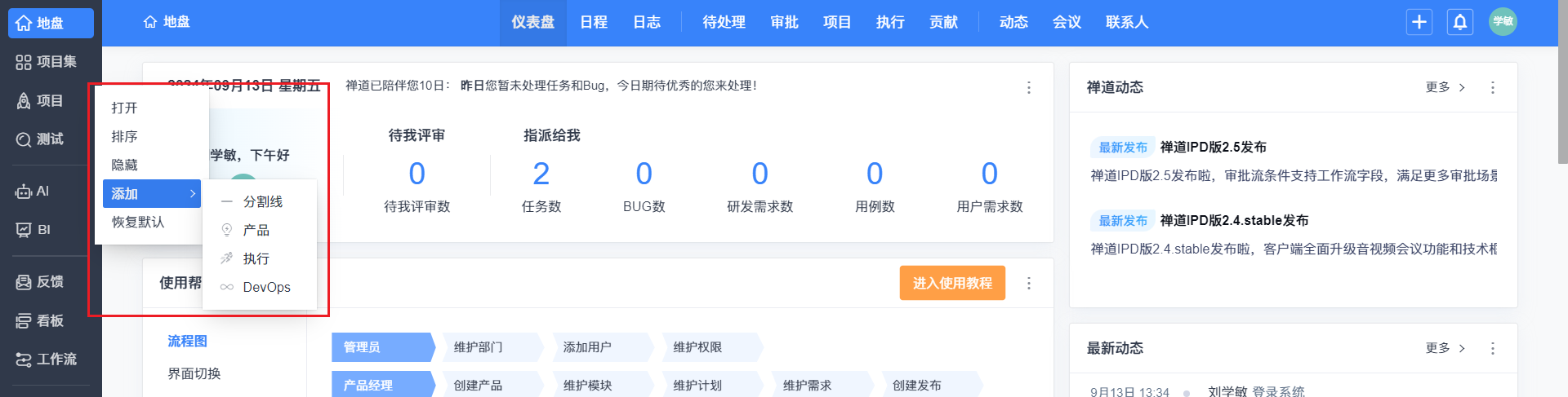 - 仪表盘内容升级,地盘新增产品和项目维度的总览和工作推进数据,产品仪表盘新增年度和月度推进数据、Bug和发布统计数据。
