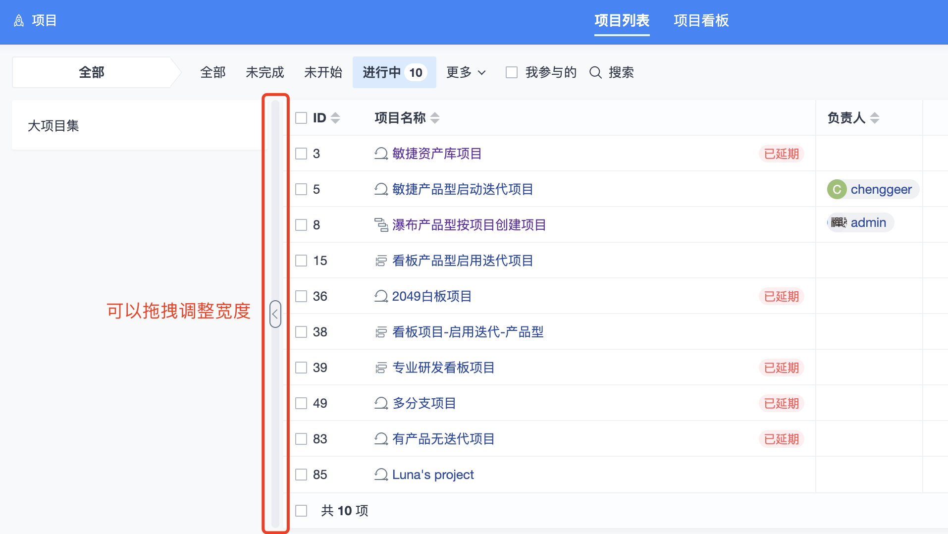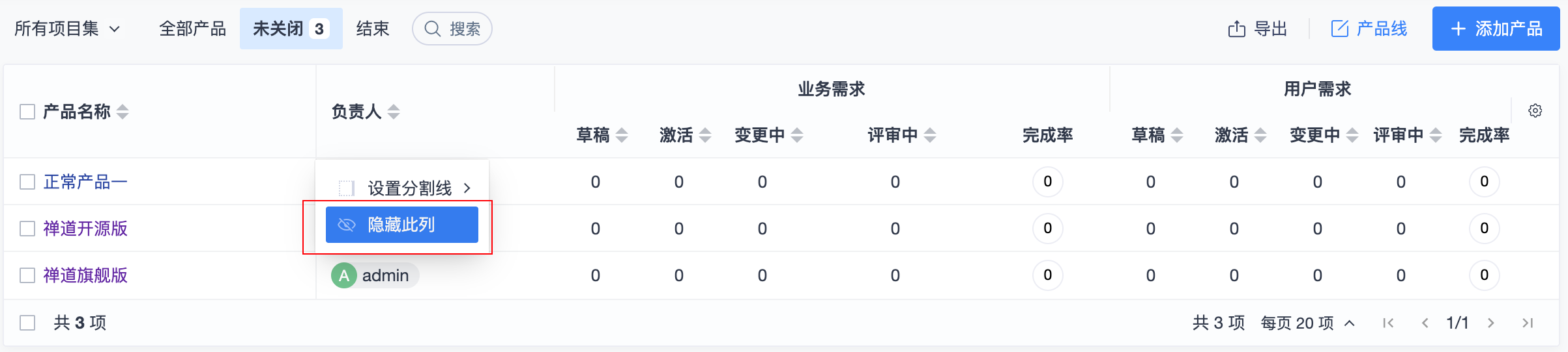 项目集列表拆分成项目视角和产品视角。