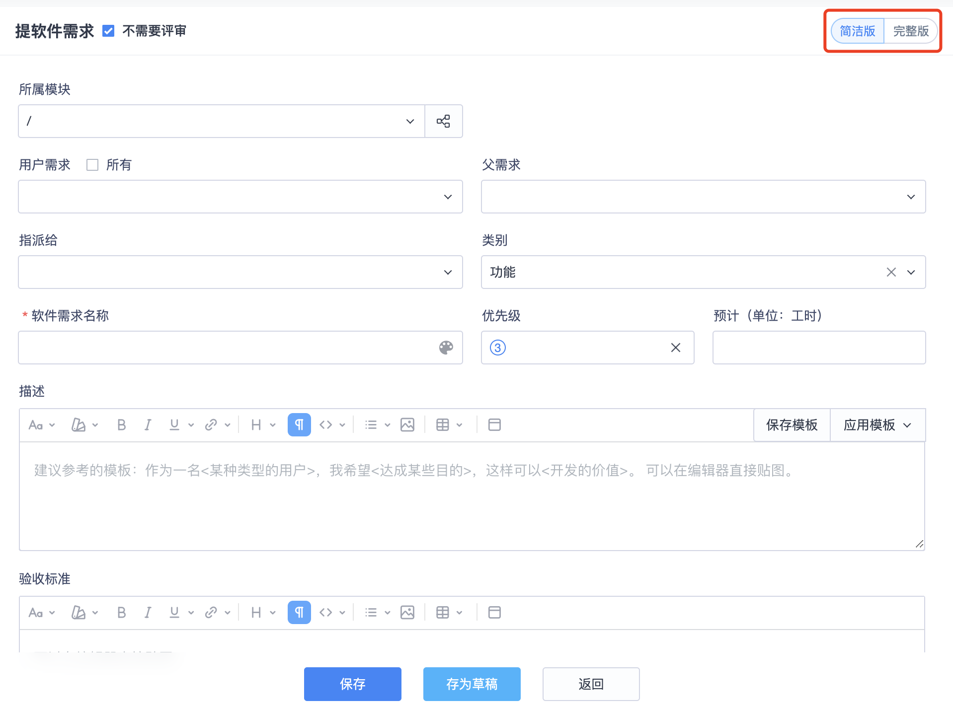 核心页面项目集、项目、产品、执行、需求、任务、Bug、用例的创建表单的排版布局调整,提供简洁版和完整版两种模式切换。