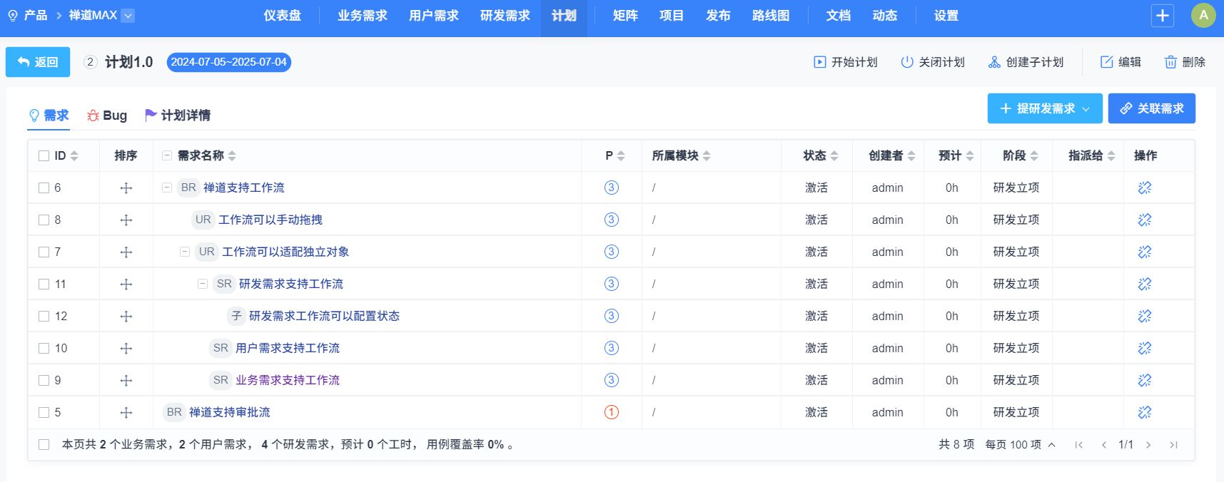 计划允许关联业务需求、用户需求、所有研发需求。