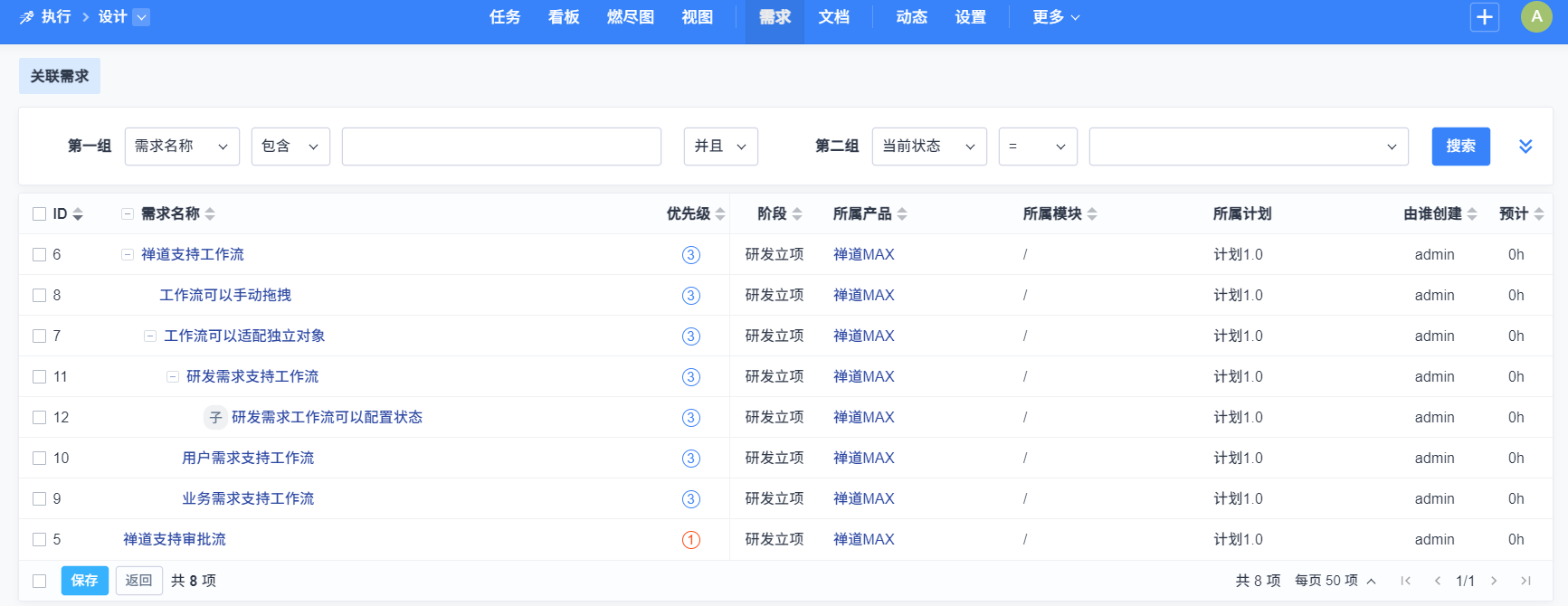 项目支持关联业务需求、用户需求、研发需求,合并为一个需求列表。