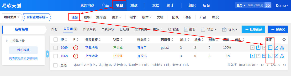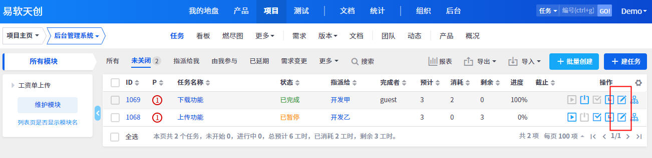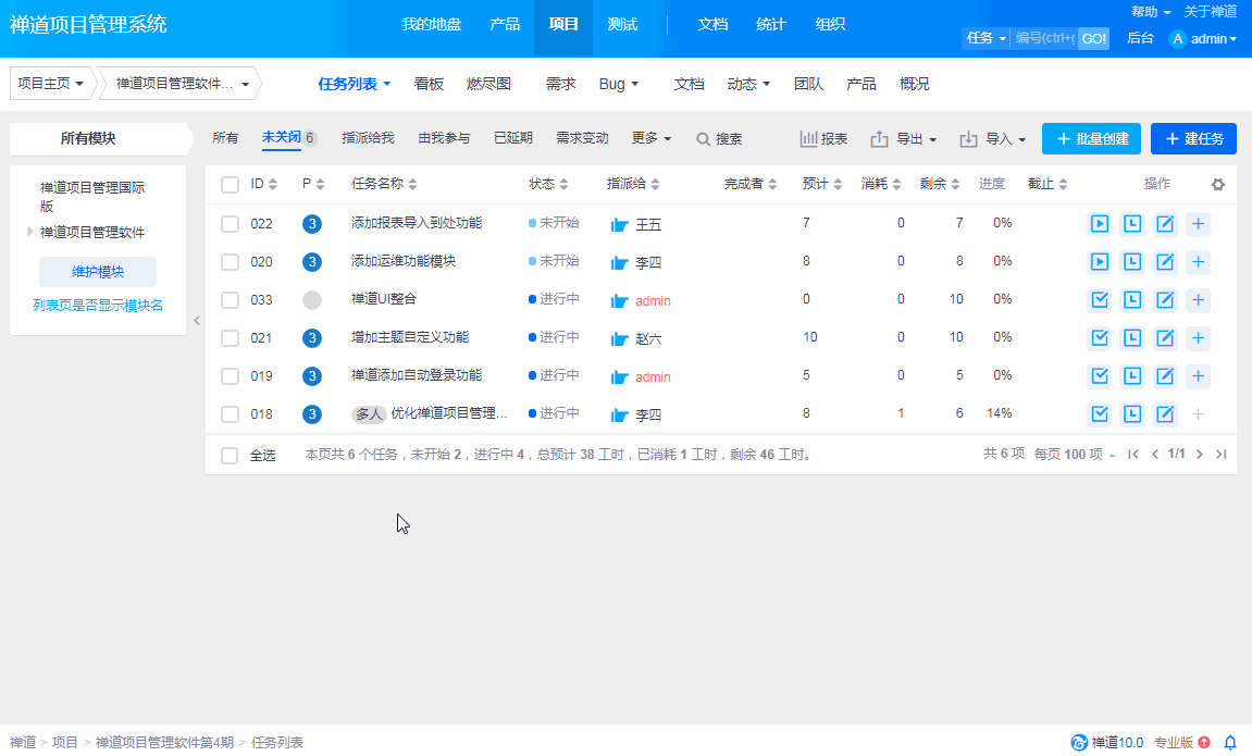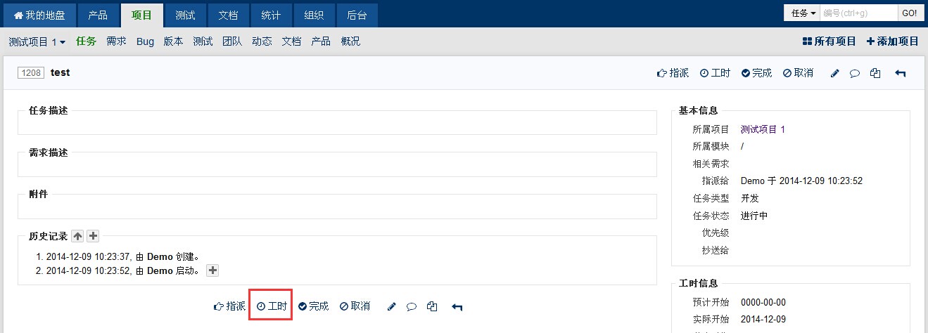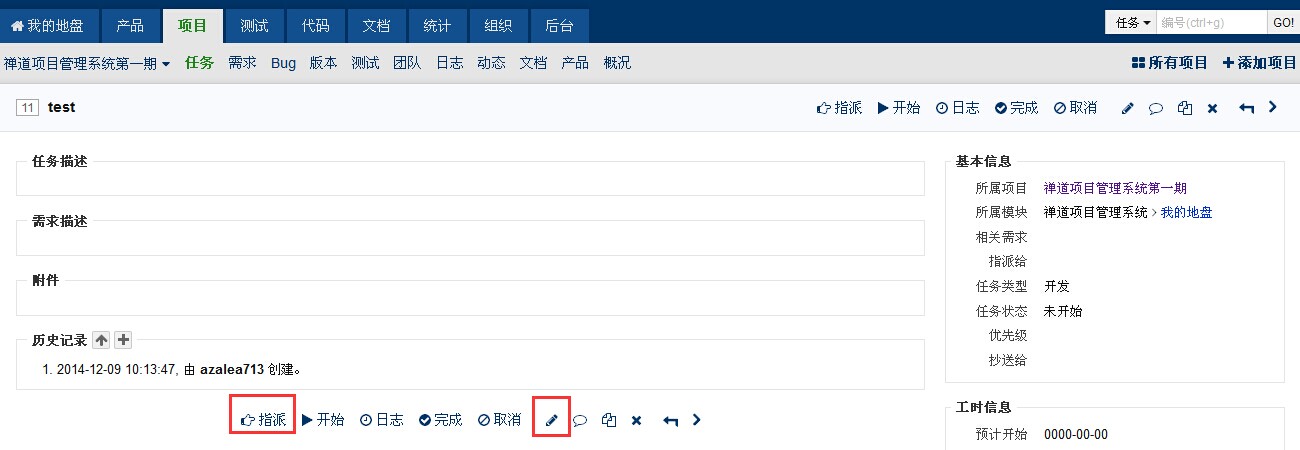 项目开始之后,每个人每天应当及时更新自己所负责的任务的状态。禅道提供了几个快捷的操作按钮:开始、完成、关闭、取消和激活。