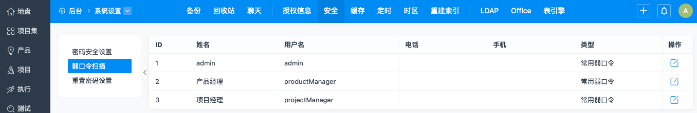 弱口令扫描页面中会列出弱口令用户的信息,可以对弱口令用户的信息进行修改。