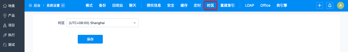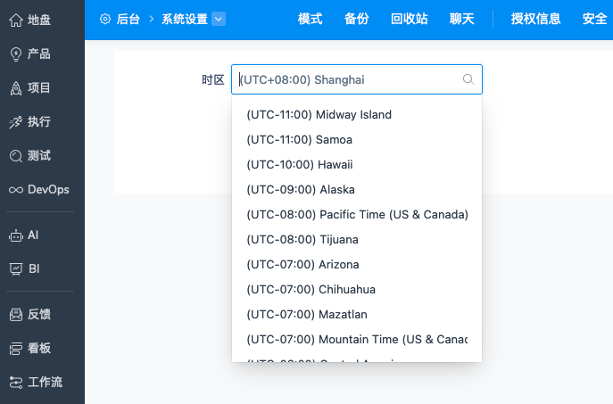 在“后台”-“系统设置”-“时区”中可以设置禅道系统中的显示时区。