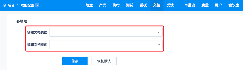 在“后台”--“功能配置”--“文档”中设置文档创建和编辑页面的必填项。