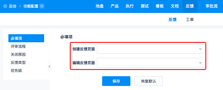 在“反馈”-“反馈”-“必填项”中配置反馈在创建和编辑页面的必填项。