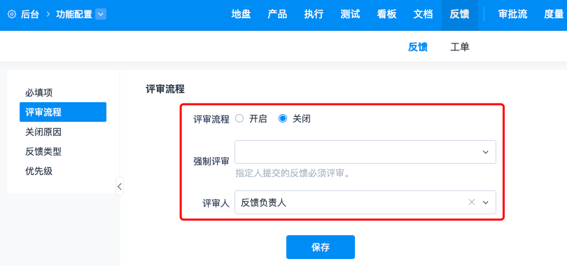 在“反馈”-“反馈”-“评审流程”中配置反馈是否启用评审流程。强制评审,如果设置了强制评审人,那么无论评审流程是否启用,强制评审人员提交的反馈都需要走评审流程。
