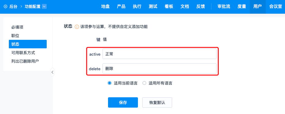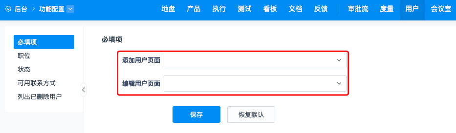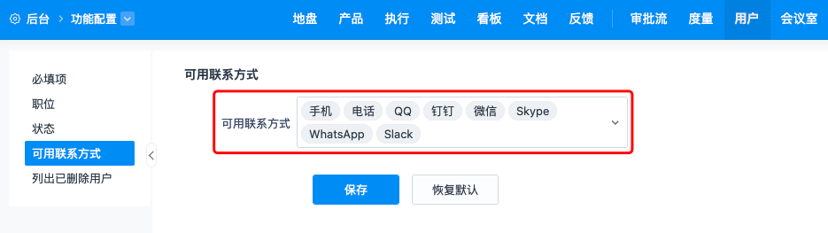 在“后台”--“功能设置”--“用户”中支持设置用户的必填项、职位、状态、可用联系方式、列出已删除用户等设置。