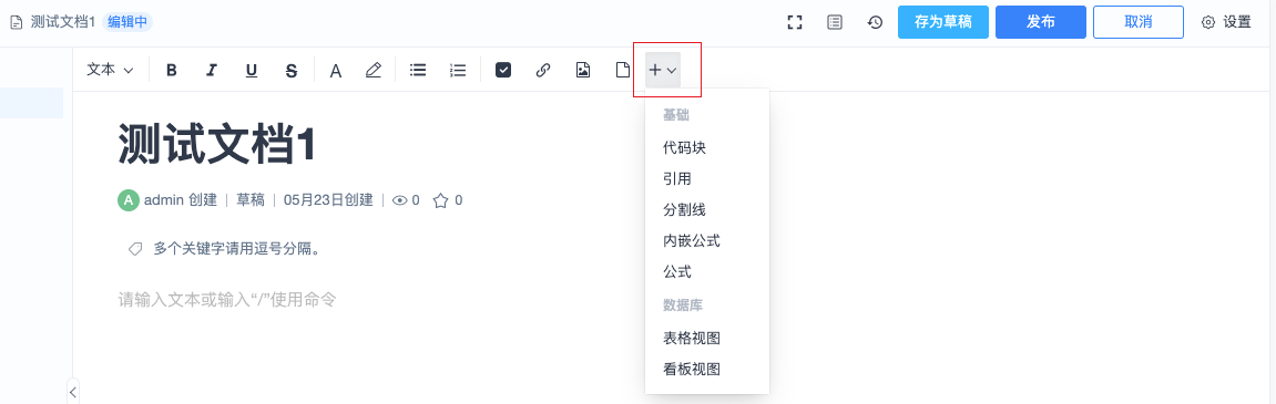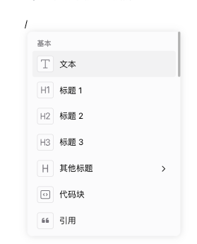 【20.8版本起】【开源版及以上版本】文档更换了新编辑器,支持通过简单的“/”命令输入快速执行常用操作,增加了一些编辑器的功能。