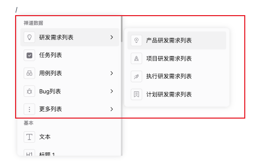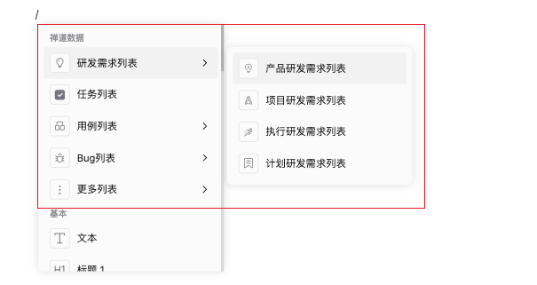 【21.4版本起】【开源版及以上版本】文档新编辑器,支持“/”命令插入禅道数据列表。