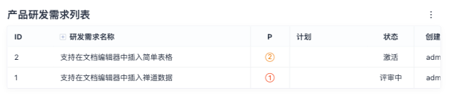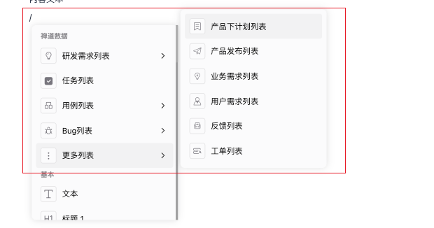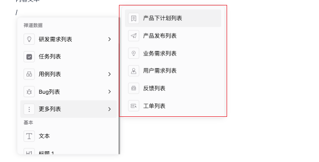 目前支持插入的数据类型包含:研发需求列表、任务列表、用例列表、Bug列表、更多列表。