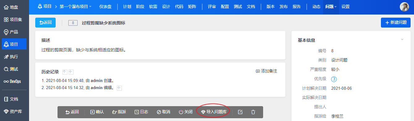和项目中的问题一样,可以添加到风险,并导入资产库--风险库中进行管理。