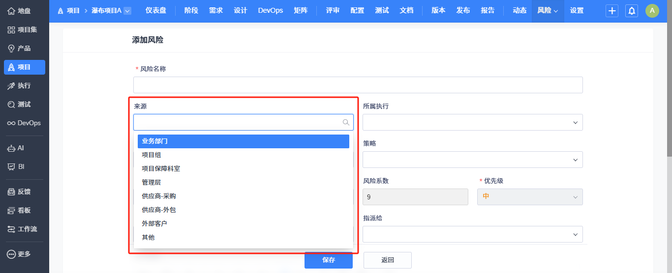 对于风险的来源、类型和策略,禅道内置了下拉选项。