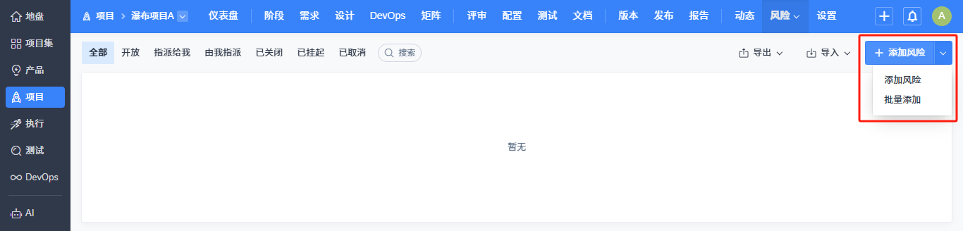 禅道旗舰版中,项目设置了风险功能模块,方便对风险进行管理。