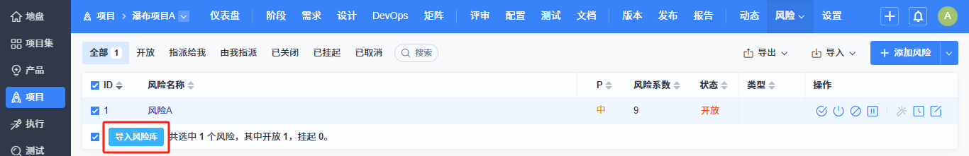 和项目中的问题一样,可以添加到风险,并导入资产库--风险库中进行管理。