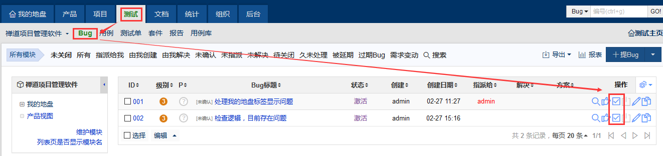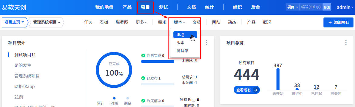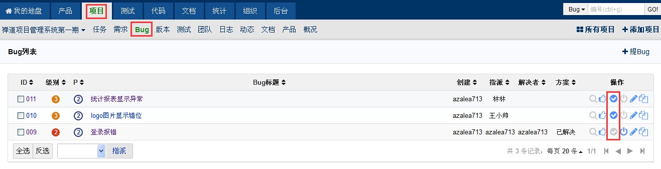 如果创建Bug选择了所属项目,那么还可以在项目---Bug下查看到与该项目相关的Bug。