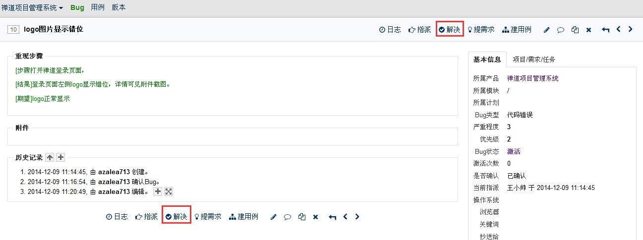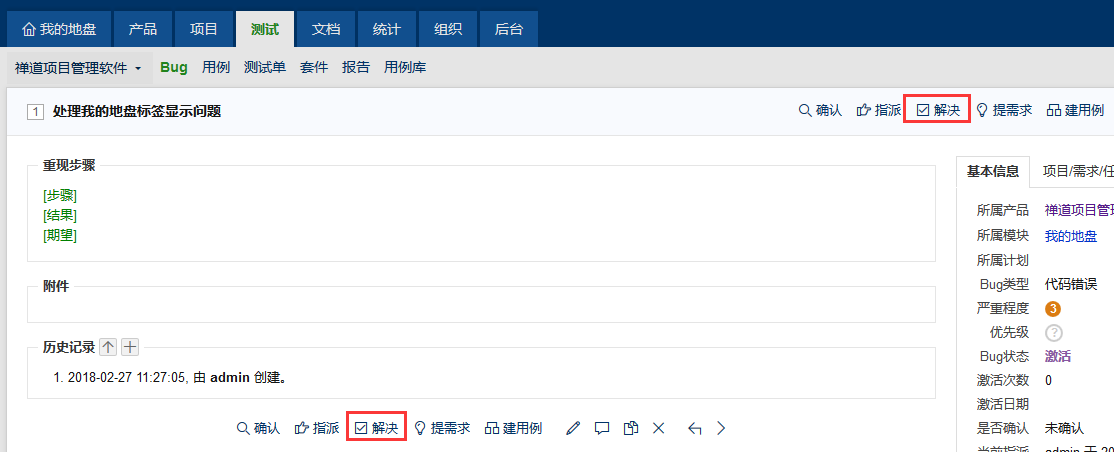 2. 点击bug标题,在bug的详情页面也可以找到“解决”操作的按钮。