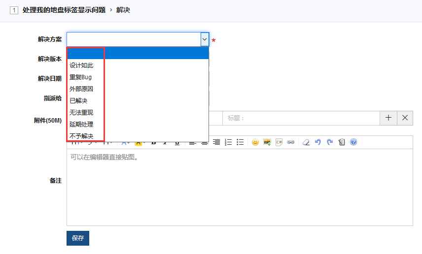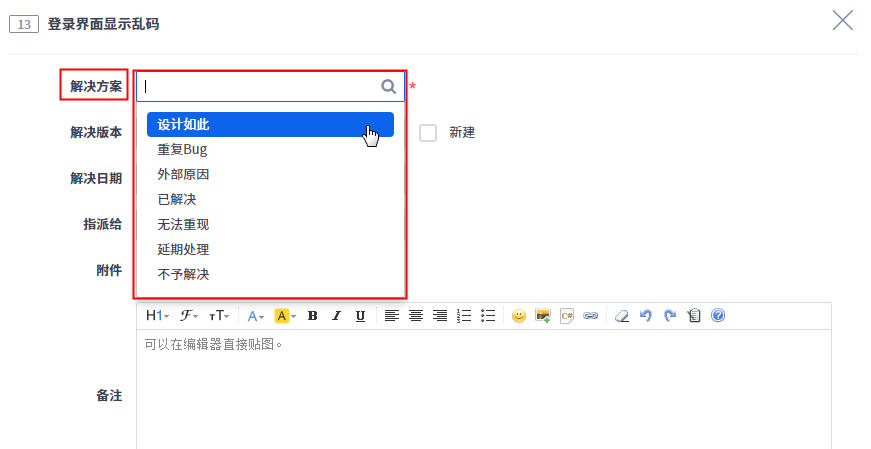 3. 解决Bug的时候,需要填写Bug的解决方案。