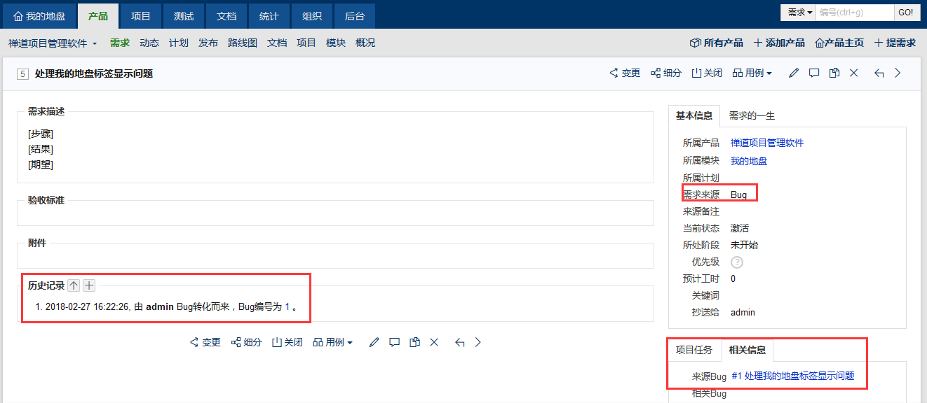 成功转为需求的Bug,在历史记录、需求来源、相关信息里会记录相关信息。