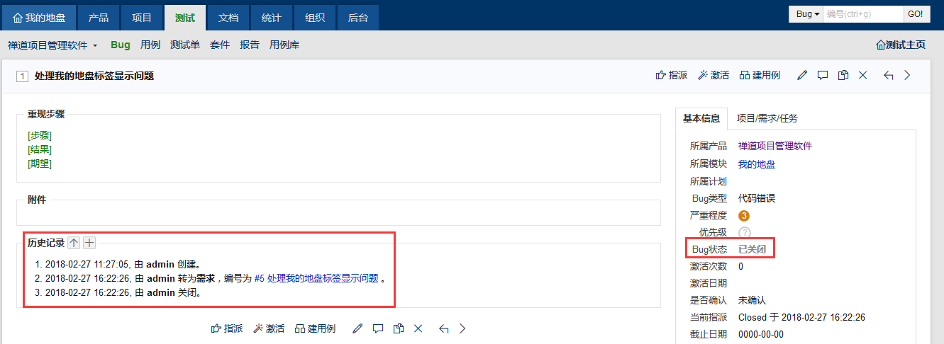 - Bug成功转为需求后,该Bug默认就自动关闭了。关于该Bug后面的信息跟踪已经转为需求页面了。