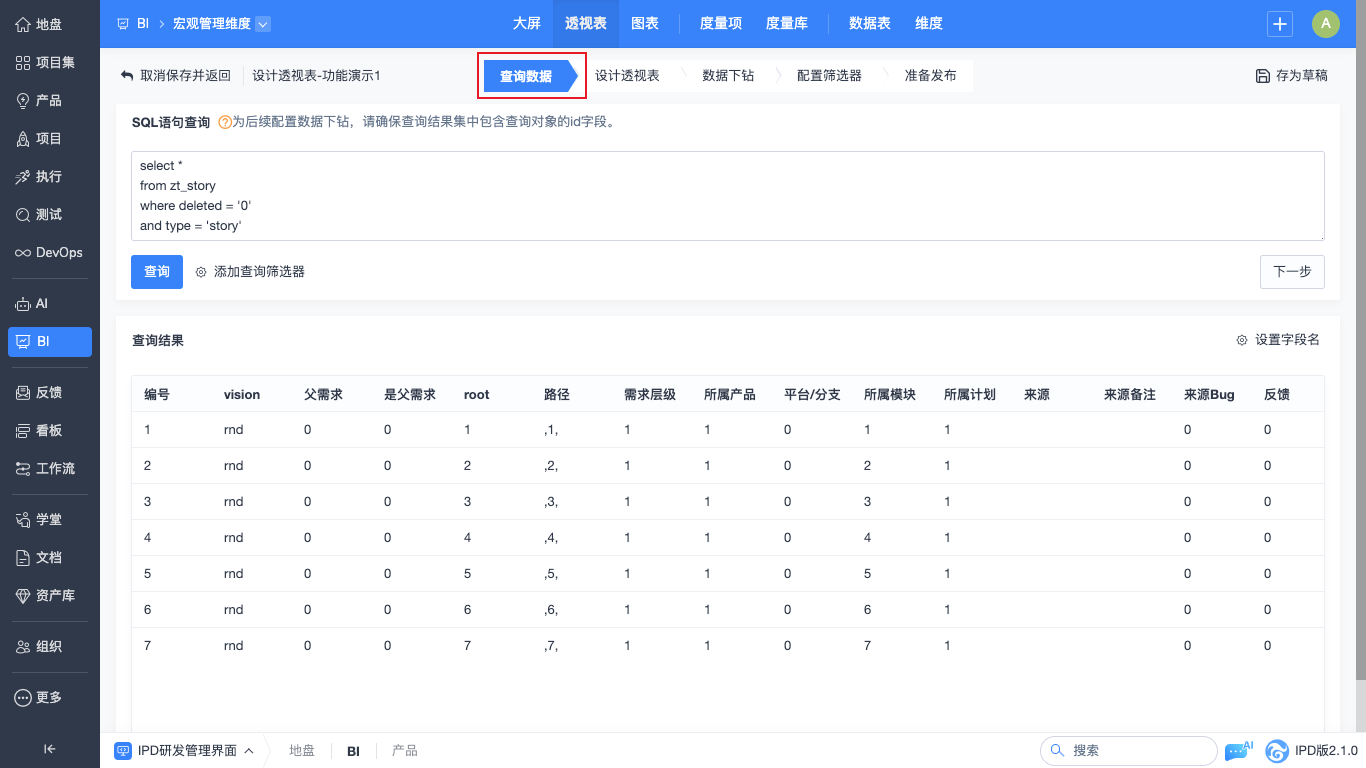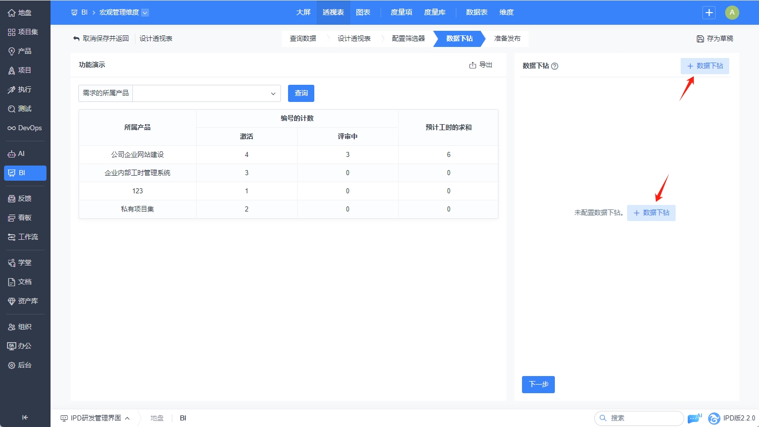 跨维度数据分析:当透视表中汇总数据异常或需进一步验证时,通过下钻功能可快速查看底层明细数据,定位具体问题来源(如某迭代任务优先级分布异常)。