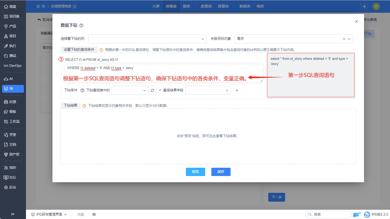1.第一步查询SQL语句中跟列字段相关的where条件,表连接等信息也要同步配置在下钻SQL中;