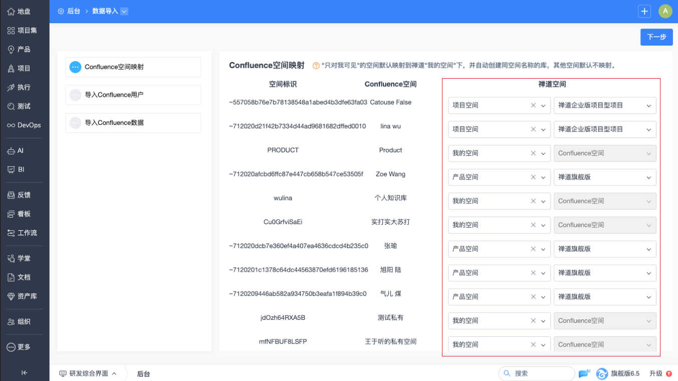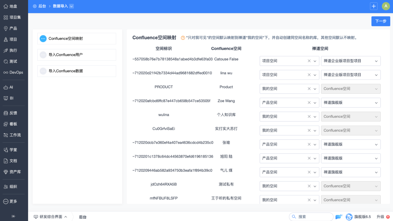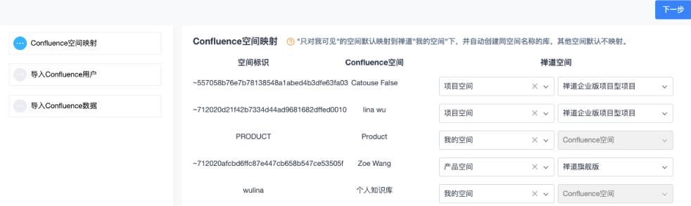点击「下一步」完成环境连接,进入导入Confluence用户页面。
