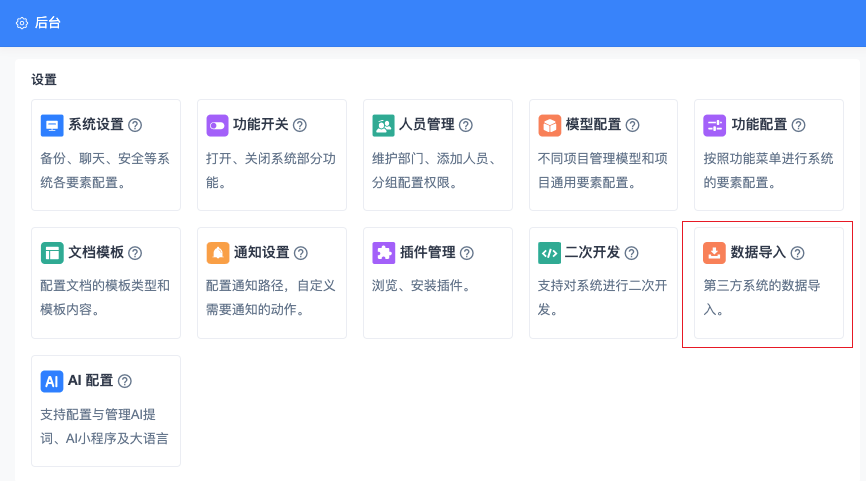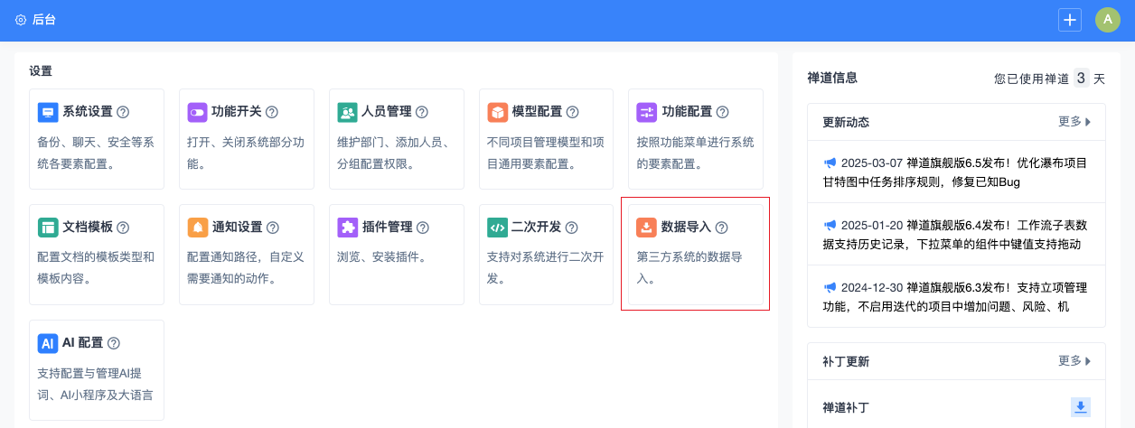 - 在导入前,建议对禅道现有数据进行备份,以防止数据丢失或冲突。