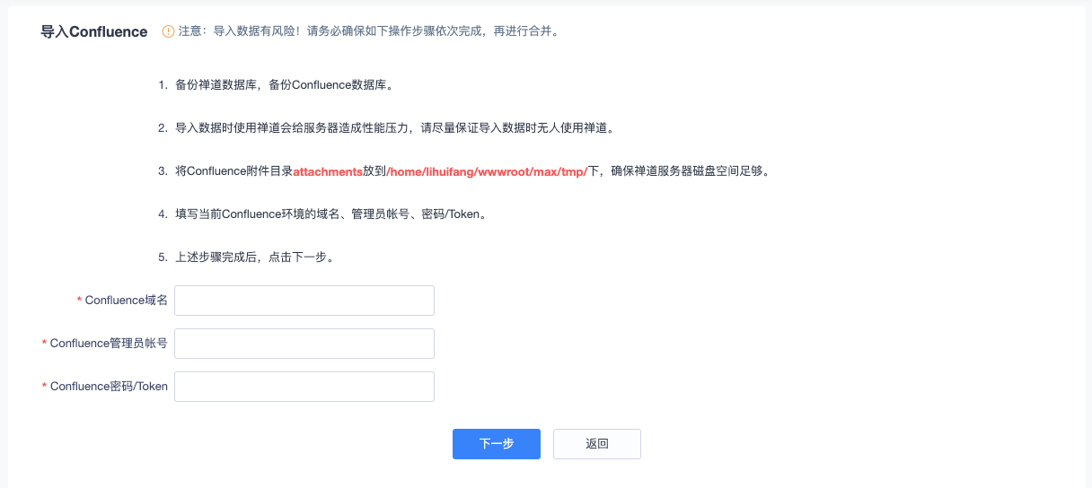 - 确认 Confluence 版本、部署方式与禅道版本、部署方式匹配,确保可正常进行数据导入。