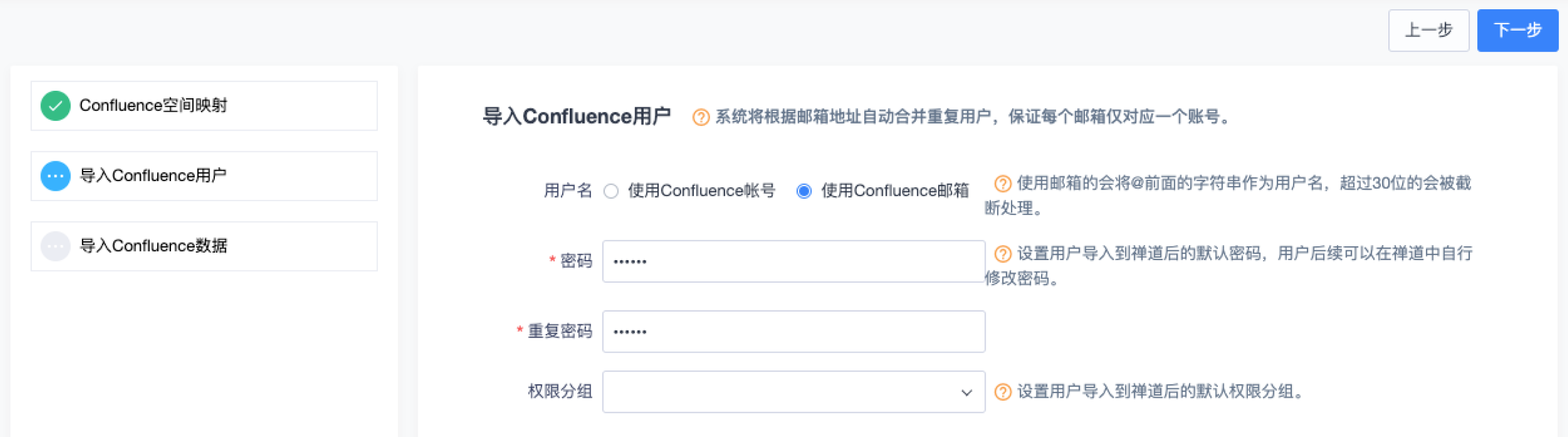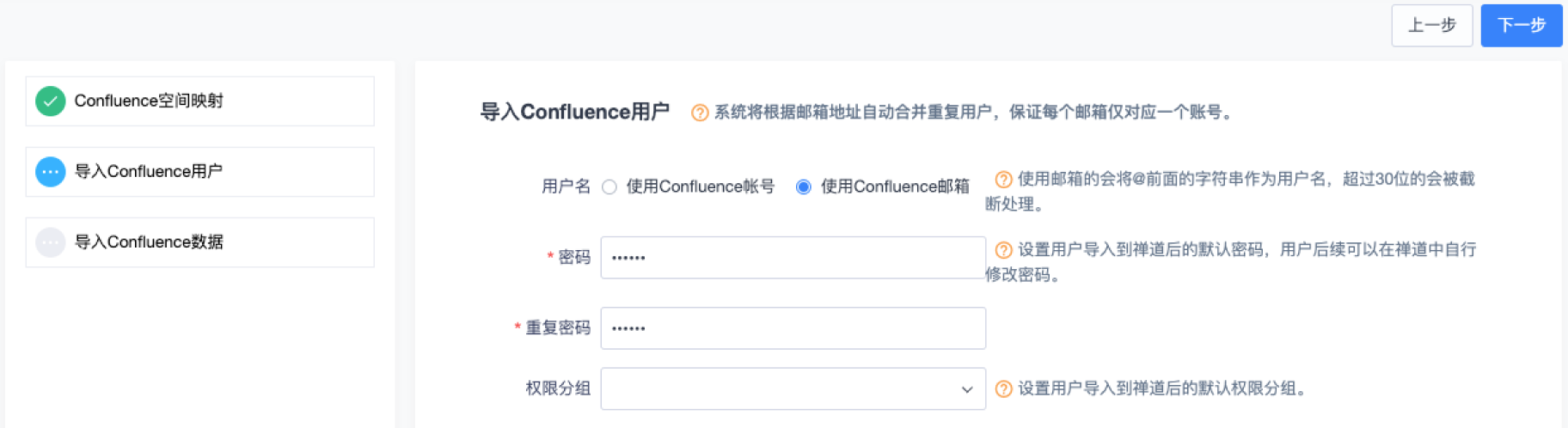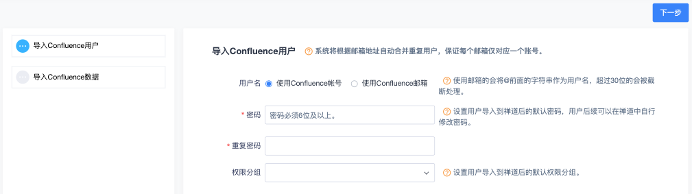 注:如系统中有邀请用户,推荐选择使用Confluence邮箱导入。无法获取到邮箱的用户,导入后禅道系统默认生成用户名“Confluence1、Confluence2...”,可通过用户名完成登录。