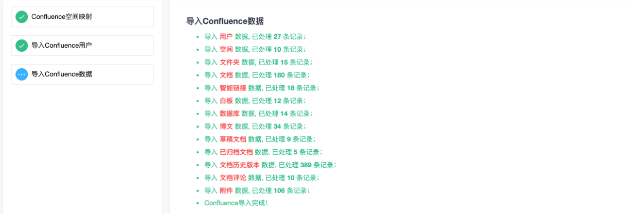 - 用户:导入所有 Confluence 用户,暂不支持导入 Confluence 中的用户群及用户的权限。