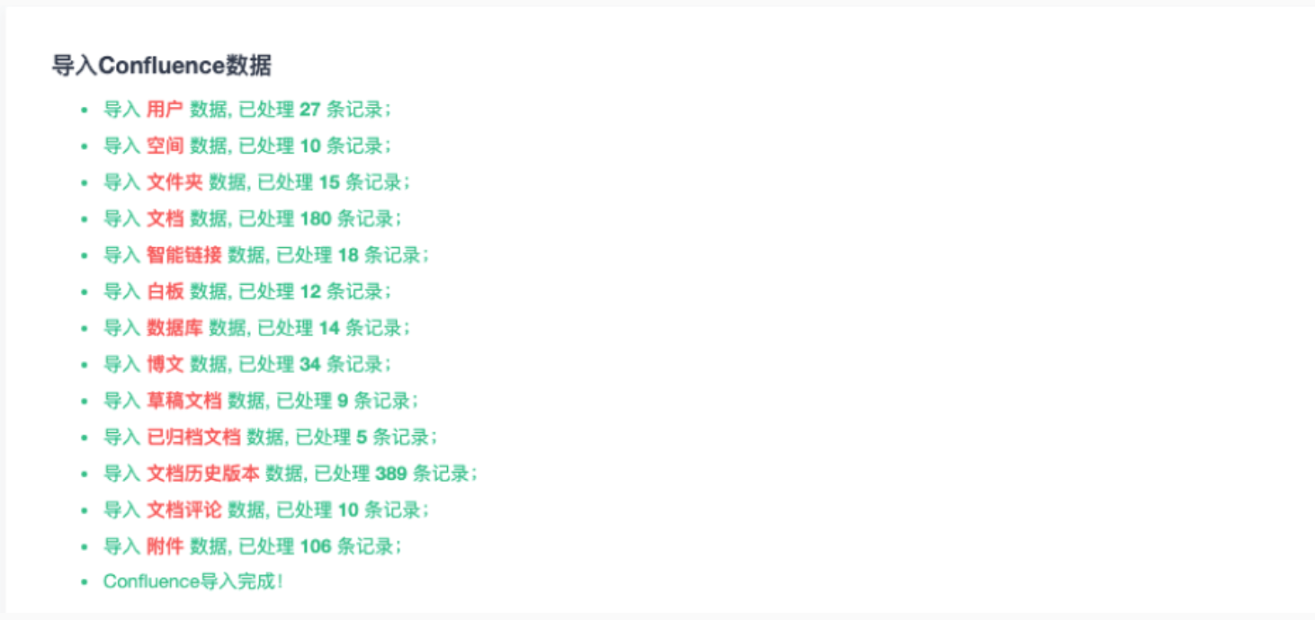 所有类型数据导入成功之后,程序会提示“导入成功”,此刻,Confluence 数据导入完成!