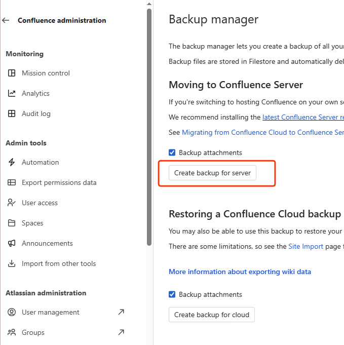 - 如果 Confluence 仍在运行,建议在导出数据前将其切换为维护模式,以避免在导出过程中产生新数据。