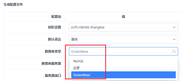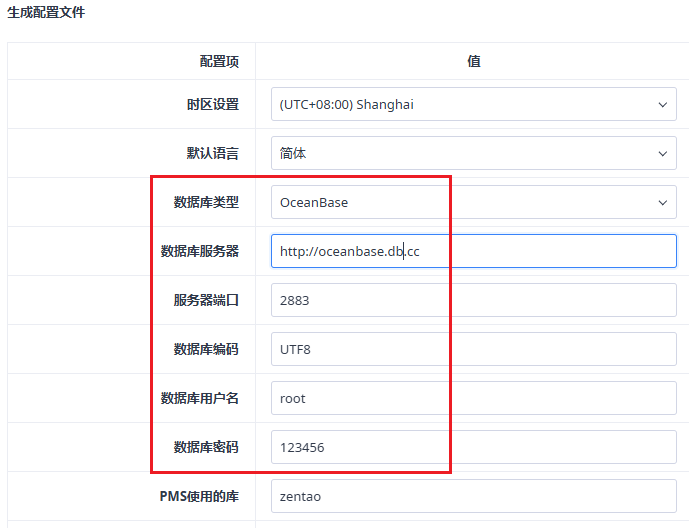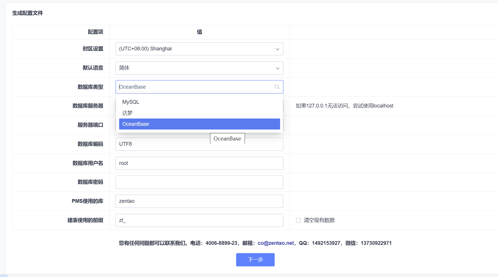 安装OceanBase成功以后,在禅道的安装向导中的数据库类型可以选择OceanBase。
