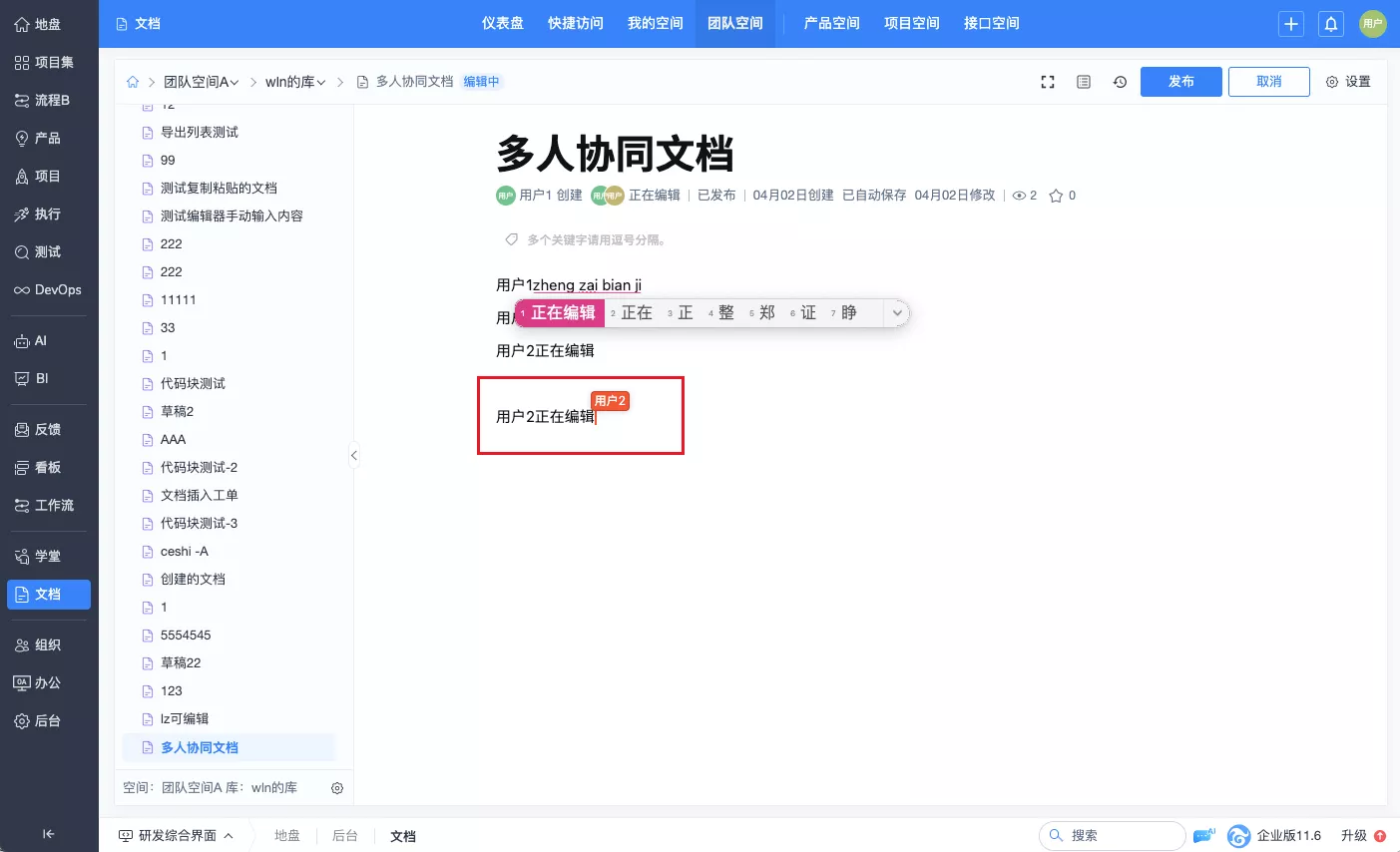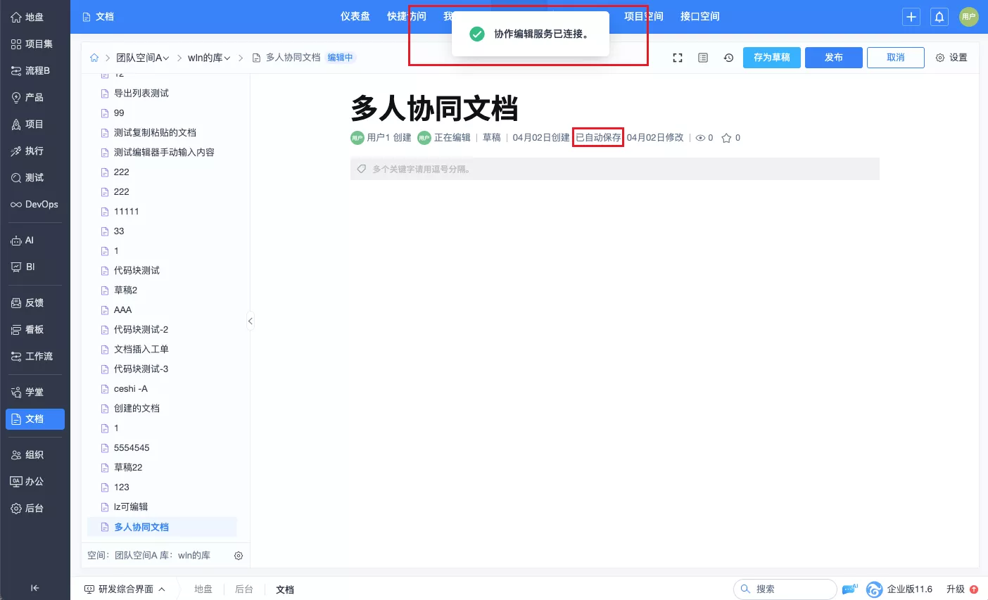 【11.6.stable版本起】【企业版及以上版本】研发管理界面的文档新增了多人协作,只需按照对应的系统下载部署协作服务,即可在禅道文档实现多人在线协同编辑并实时保存。