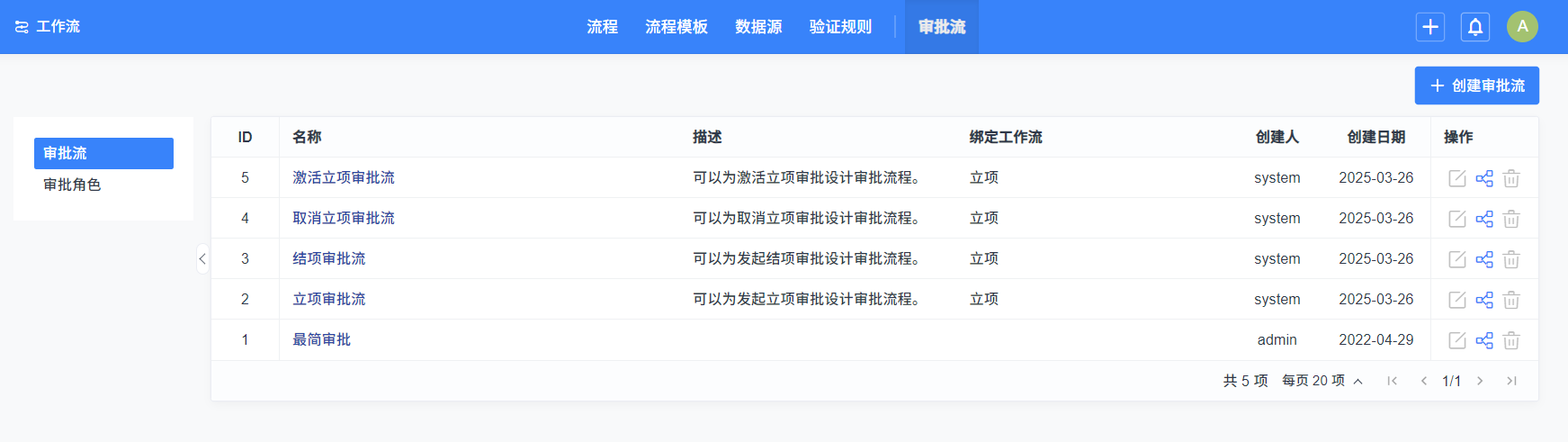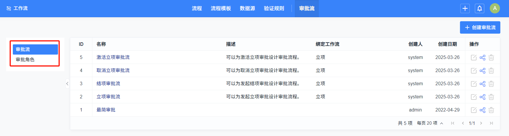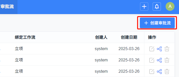 进入到审批页面后,可以点击创建审批流按钮来新增审批流程,或在列表右侧操作按钮中编辑已有的审批流:
