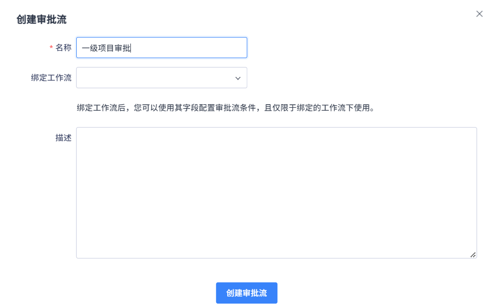 在创建审批流的页面需要填写审批流名称、类型、描述信息。