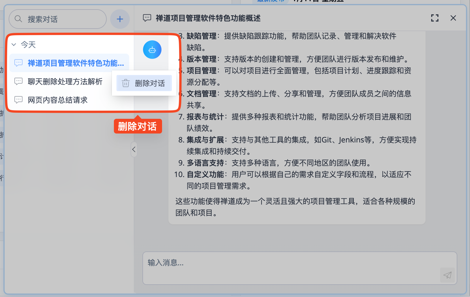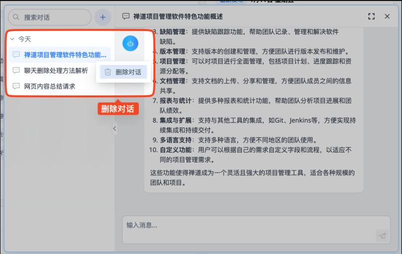 点击对话列表项右侧的“更多”按钮,在菜单中选择“删除”,即可将该对话从历史列表中移除。