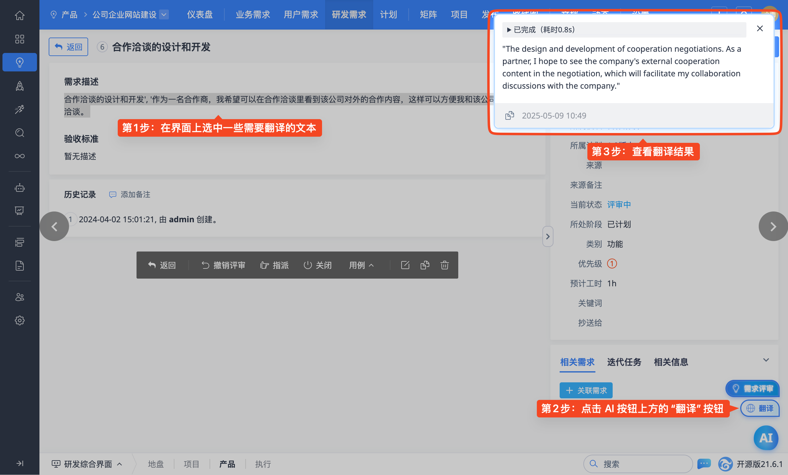 禅道 AI 插件提供“翻译”功能。在页面选中需要翻译的内容后,全局 AI 按钮上方会显示“翻译”快捷按钮;点击后,会在页面右上方弹出面板展示翻译结果。