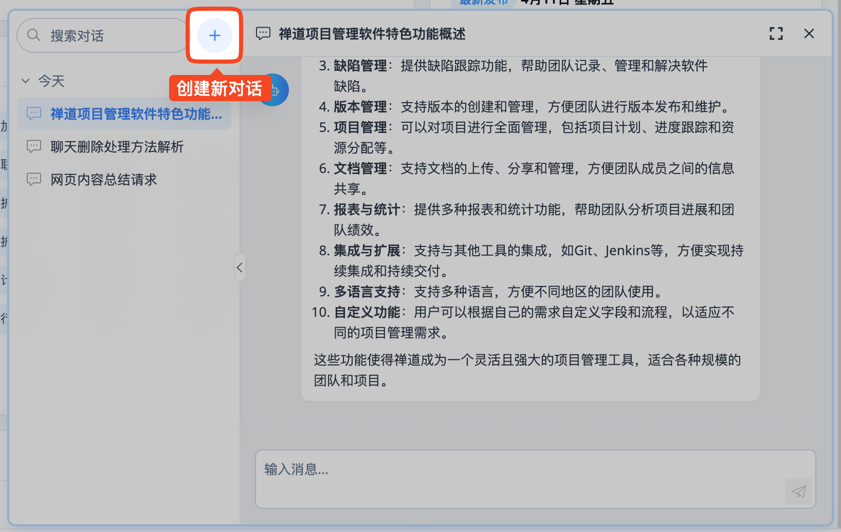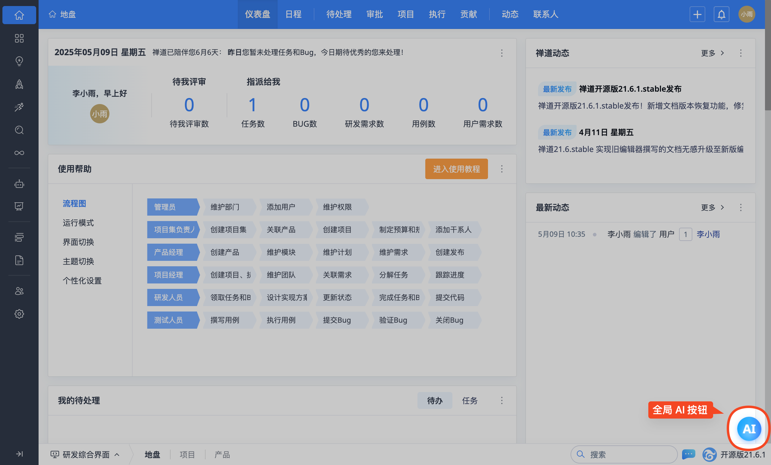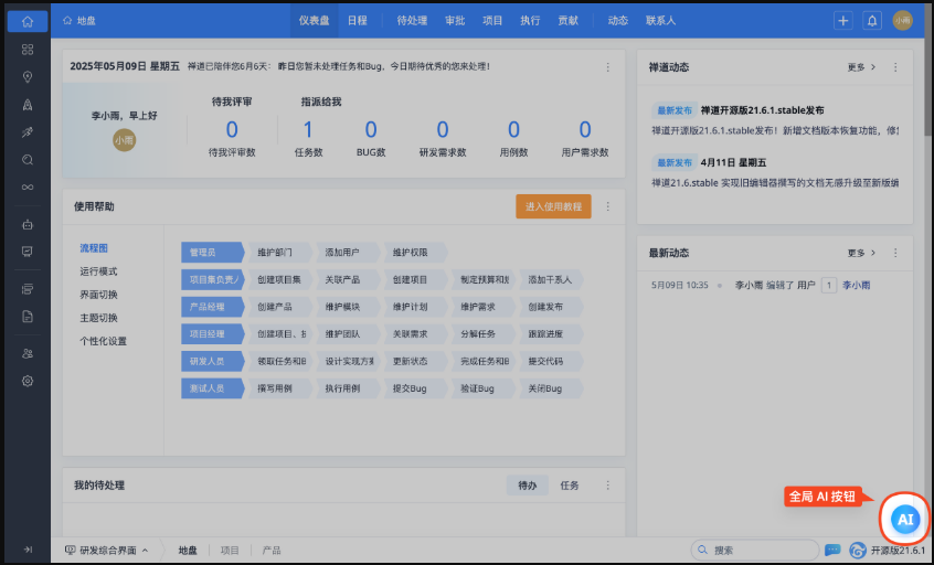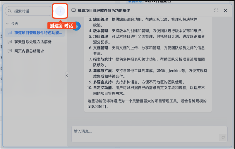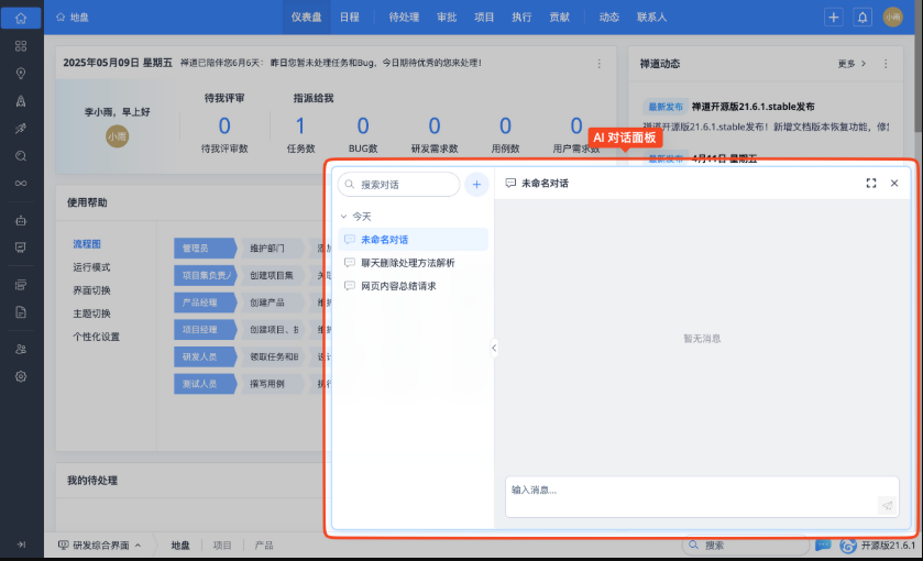 在禅道界面右下角会显示一个全局 AI 功能按钮。该按钮作为通用 AI 对话入口,点击后会弹出 AI 对话面板,可输入文本与大模型对话。同时,按钮上方会智能提示当前可用的 AI 功能,点击即可使用。
