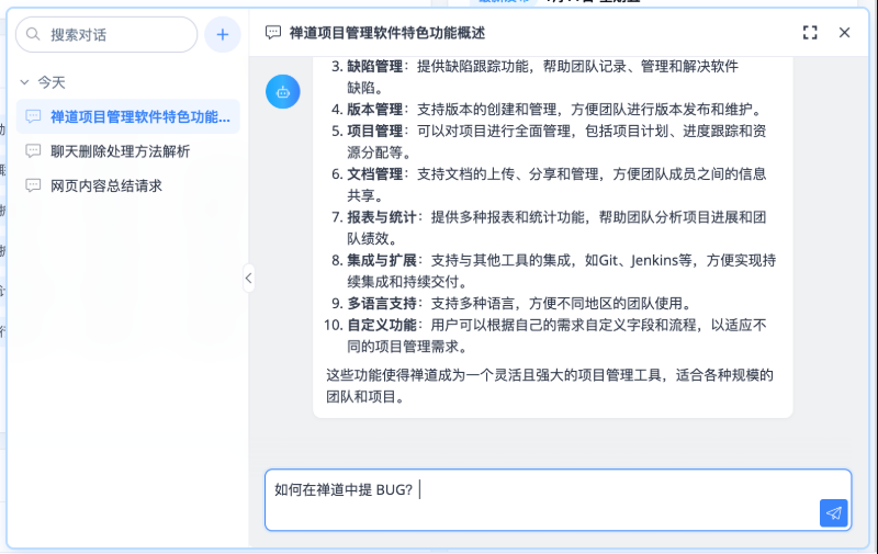 - 基于禅道数据向量化的上下文,以最后一次同步时的数据为准,不会实时根据禅道当前数据更新;